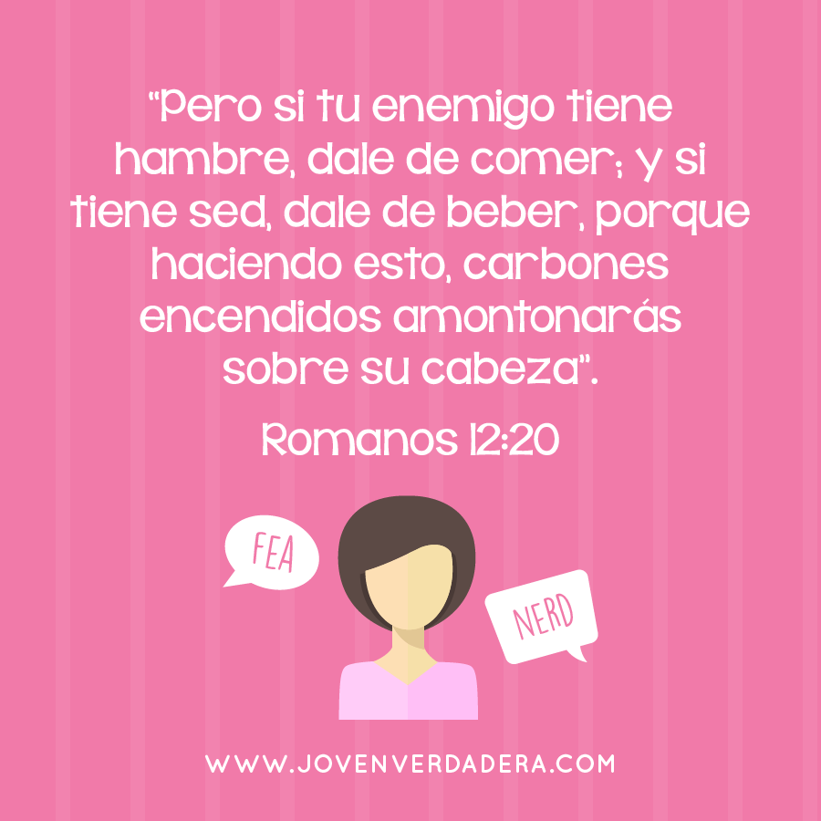 Jesús sabía un poco sobre ello. Lo mismo David. También Pablo. Abre la Palabra y compruébalo. No estás sola. He visto estudiantes, quienes luchan con chicas rudas, crecer tremendamente en el Señor si reaccionan con la actitud correcta. Memoriza Romanos 12:20: “Pero si tu enemigo tiene hambre, dale de comer; y si tiene sed, dale de beber, porque haciendo esto, carbones encendidos amontonaras sobre su cabeza”. Amontonar carbones encendidos estaba destinado a ser una manera de reconfortar un viajero que tenía frio y necesitaba ser calentado. El deseo de Dios para nosotros es crear una gran bendición para aquellos quienes nos hacen daño.