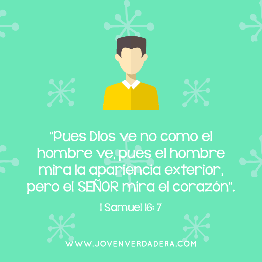"Pero el SEÑOR dijo a Samuel: No mires a su apariencia, ni a lo alto de su estatura, porque lo he desechado; pues Dios ve no como[a] el hombre ve, pues el hombre mira la apariencia exterior, pero el SEÑOR mira el corazón". (1 Samuel 16: 7).