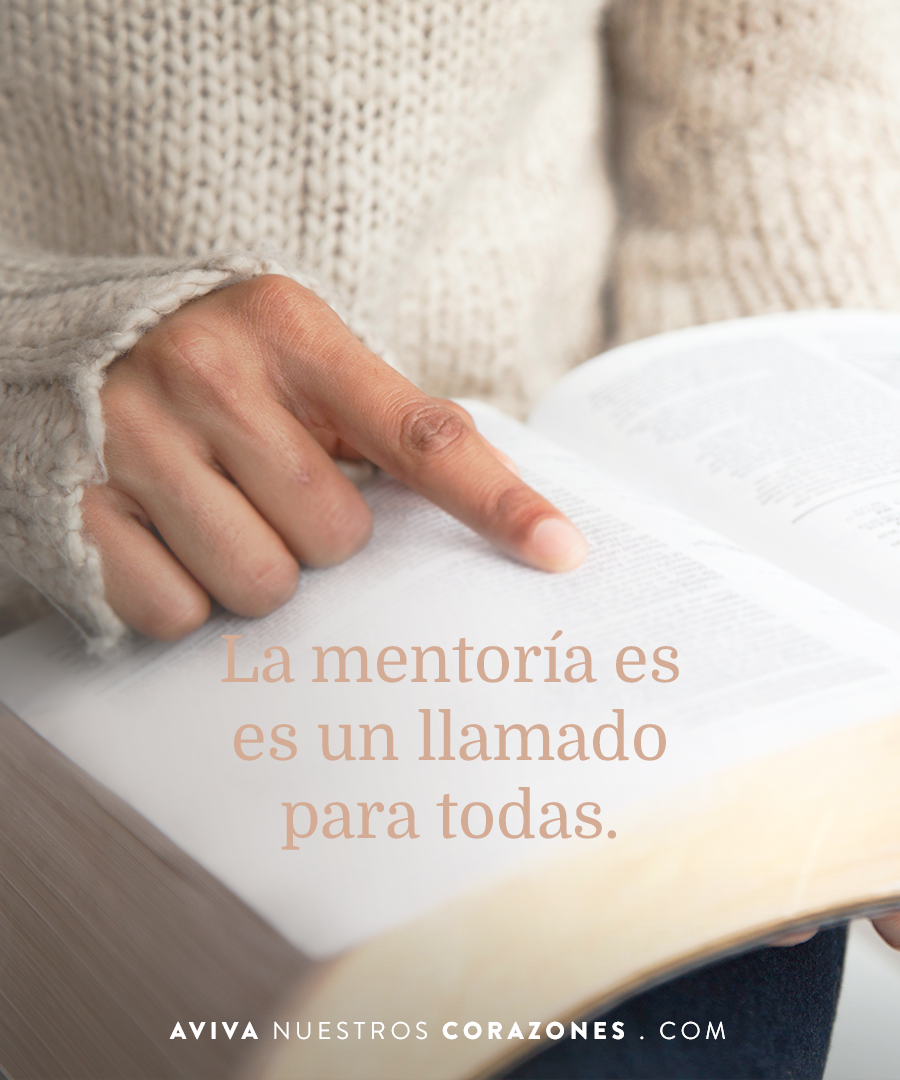 Por muy útil que pueda ser la mentoría natural y en el momento, también se necesita enseñanza, recursos y herramientas para hacerlo. Esto puede incluir talleres o clases donde la mentoría sea el foco. También puede incluir señalar los principios y verdades de la mentoría dentro de los estudios bíblicos, ya sea que se trate de un libro de la Biblia en particular o de un estudio temático. Luego, equípate a ti misma y a otras mujeres con recursos sólidos (libros, blogs, pódcast y más) sobre el tema. ¡Estoy muy agradecida de que muchos de esos recursos estén aquí mismo en la página web de Aviva Nuestros Corazones!
