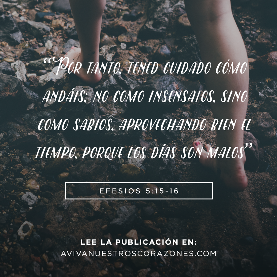 Por tanto, tened cuidado cómo andáis; no como insensatos, sino como sabios, aprovechando bien el tiempo, porque los días son malos. Así pues, no seáis necios, sino entended cuál es la voluntad del Señor. Y no os embriaguéis con vino, en lo cual hay disolución, sino sed llenos del Espíritu, hablando entre vosotros con salmos, himnos y cantos espirituales, cantando y alabando con vuestro corazón al Señor; dando siempre gracias por todo, en el nombre de nuestro Señor Jesucristo, a Dios, el Padre; sometiéndoos unos a otros en el temor de Cristo. Efesios 5:15-21 (LBLA)