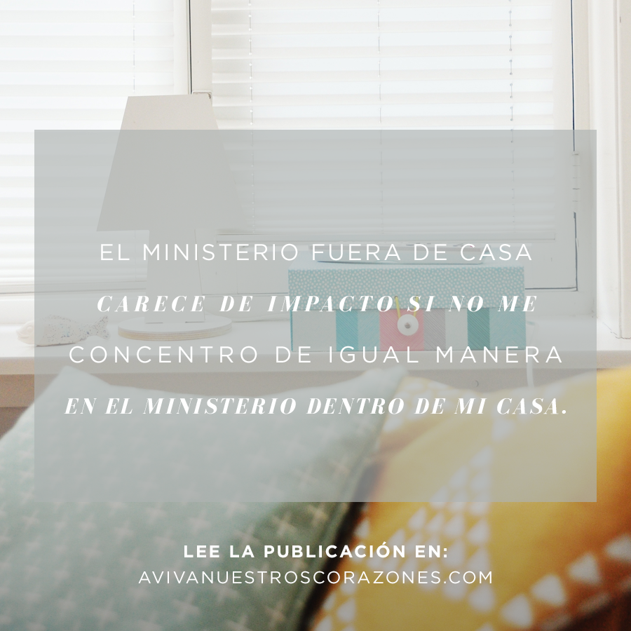 Una cosa que el Señor me ha estado mostrando es que todo el ministerio fuera de casa no tiene significado si no me concentro de igual manera en el ministerio dentro de mi casa. Si mi esposo e hijos no son tratados al menos con el mismo cuidado, amor y respeto con que trato a las mujeres en diferentes eventos, entonces mis prioridades están fuera de lugar.