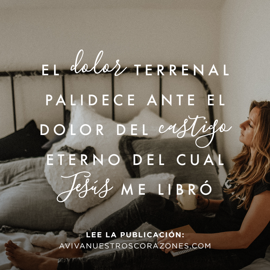 Me recuerda de dónde me rescataste. De la maldad, de la iniquidad, de hablar falsedad, del engaño. Pecado y muerte. Te ocupaste de mi mayor necesidad; cuando estaba atrapada, muerta en mi pecado. ¡Me diste vida junto con Cristo! Sanaste la enfermedad del alma que me devastaba, me has lavado y limpiado por la sangre de Jesús. Aunque el dolor de mi cuerpo es grande, palidece en comparación con el dolor del castigo eterno y la separación de ti. ¡Has librado mi alma!