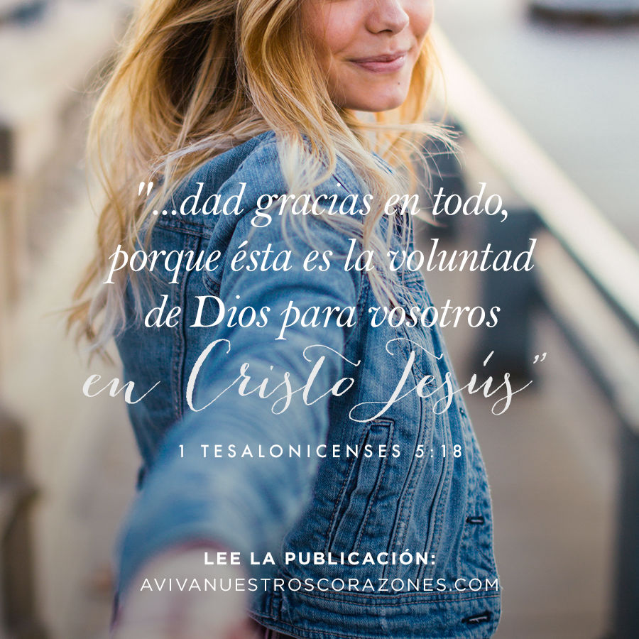 Y fue cuando encontré este versículo: "... dad gracias en todo, porque esta es la voluntad de Dios para vosotros en Cristo Jesús"(1ª Tesalonicenses 5:18). Quería saber cuál era Su voluntad para mi vida y lo deletreó por mí. Su voluntad era que yo estuviera agradecida y le diera gracias activamente por todas las cosas.