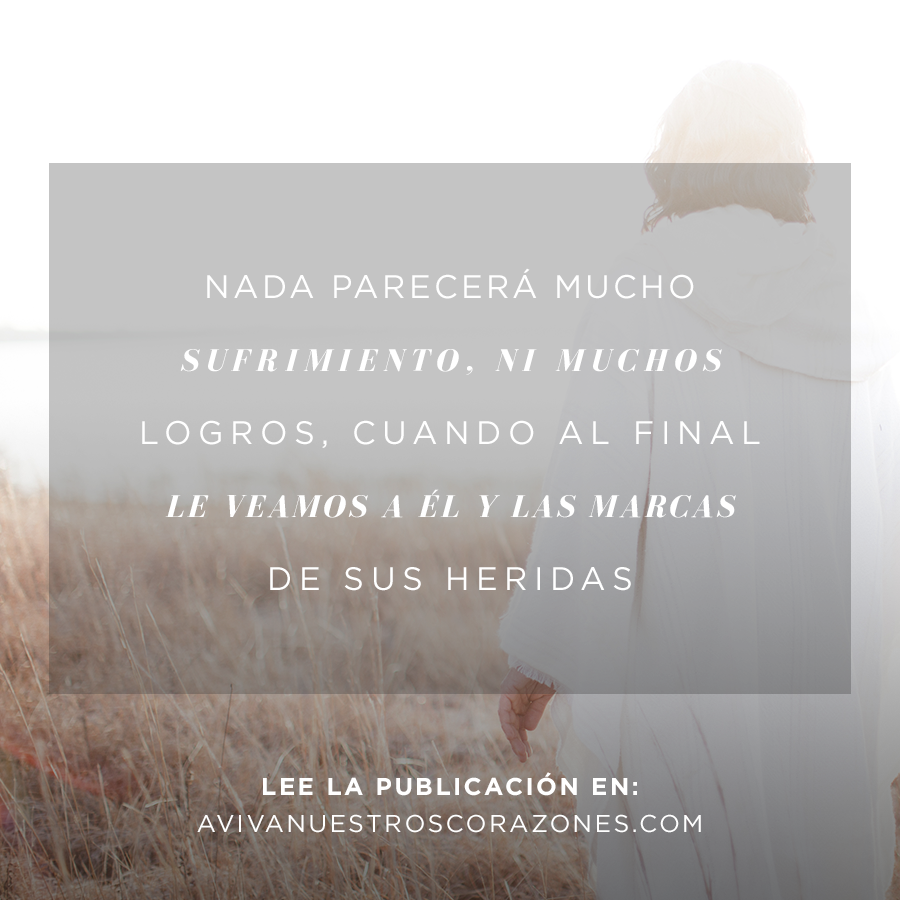 Nada parecerá mucho sufrimiento, ni muchos logros, cuando al final le veamos a Él y las marcas de Sus heridas; nada parecerá suficiente. Hasta el agotamiento de la esperanza aplazada quedará en el olvido, substituido por un gozo que no es terrenal. –Amy Carmichael, 1867-1951.