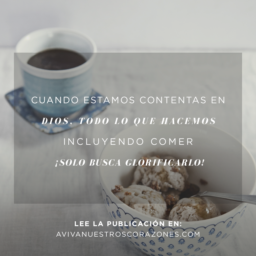 1ª Timoteo 6:6 nos dice que “la piedad, en efecto, es un medio de gran ganancia cuando va acompañada de contentamiento”. Cuando estamos contentas en Dios, Él es nuestro gran amor y todo lo que hacemos incluyendo comer, ¡solo busca glorificarlo! Sin embargo, cuando no estamos contentas en Él, buscamos cualquier otra cosa inferior para llenar el vacío que experimentamos. Este anhelo profundo de nuestro corazón fue colocado allí por Dios con el propósito de buscarle y llenarnos con Él. Cualquier ídolo solo puede llenarlo parcialmente, llevándonos a la esclavitud en la constante búsqueda de sentirnos completas. Dios es el Único que nos puede llenar totalmente y producir contentamiento porque Su deseo es nuestro bien (Jeremías 29:11).