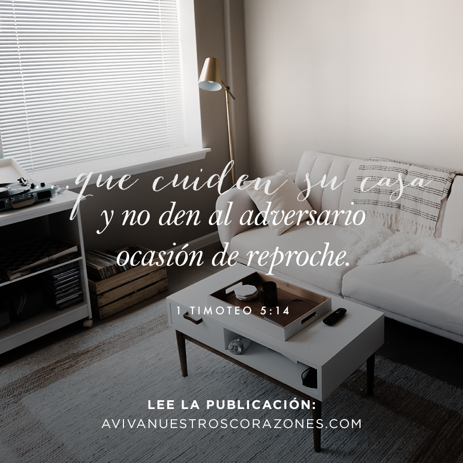 En 1ª Timoteo se da un mandato directo a las jóvenes viudas (y a las esposas en general): que cuiden su casa. Tito 2:4-5 trata de cómo las mujeres mayores deben enseñar a las más jóvenes a amar a sus esposos, a amar a sus hijos, a cuidar sus casas, etcétera. Muchos tienen diferentes opiniones sobre estos versículos y me he tomado la libertad de explicar lo que significa “cuidar la casa”. Quiero ser prudente en no añadir a la Palabra debido a mi limitado conocimiento de lo que Pablo realmente quiso decir, sí sé esto: cuidar no es controlar.