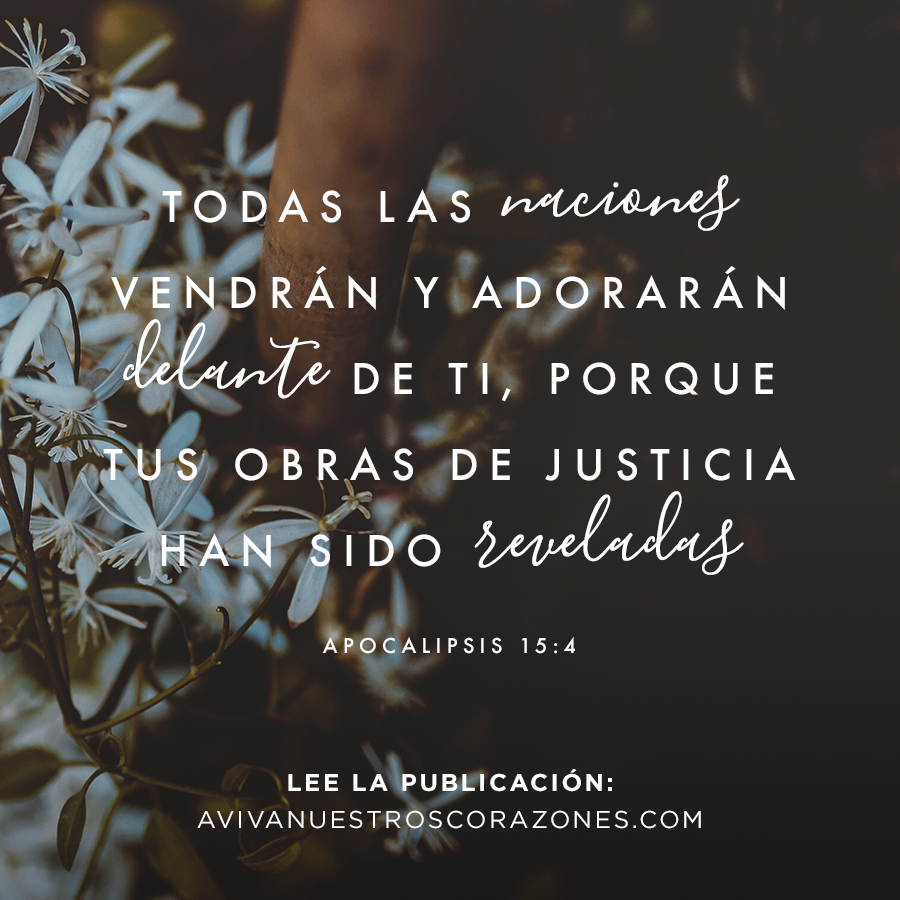 ¡Grandes y maravillosas son tus obras, oh Señor Dios, Todopoderoso! ¡Justos y verdaderos son tus caminos, oh Rey de las naciones! ¡Oh Señor! ¿Quién no temerá y glorificará tu nombre? Pues sólo tú eres santo; porque todas las naciones vendrán y ADORARÁN en tu presencia, pues tus justos juicios han sido revelados. Ap. 15:3-4