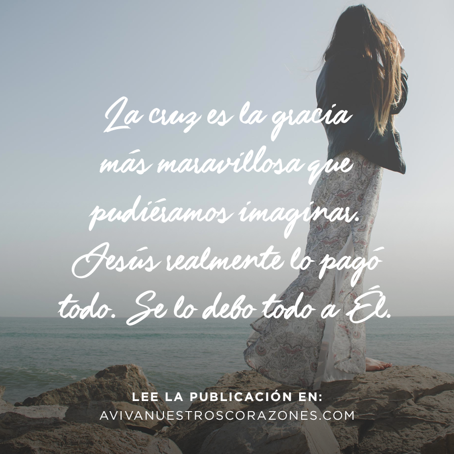 Cuando llegamos al final de nosotras mismas, y débiles corremos a Sus brazos gritando «no puedo hacerlo. No me lo puedo ganar. Te necesito Jesús», encontramos descanso para nuestra alma, dejamos de luchar, de esforzarnos cada vez más por nuestra salvación. Descubrimos que no podemos hacer otra cosa que no sea amarlo, celebrarlo, y gritar a todos los que escuchen «La cruz es la gracia más maravillosa que pudiéramos imaginar. Jesús realmente lo pagó todo. Se lo debo todo a Él».