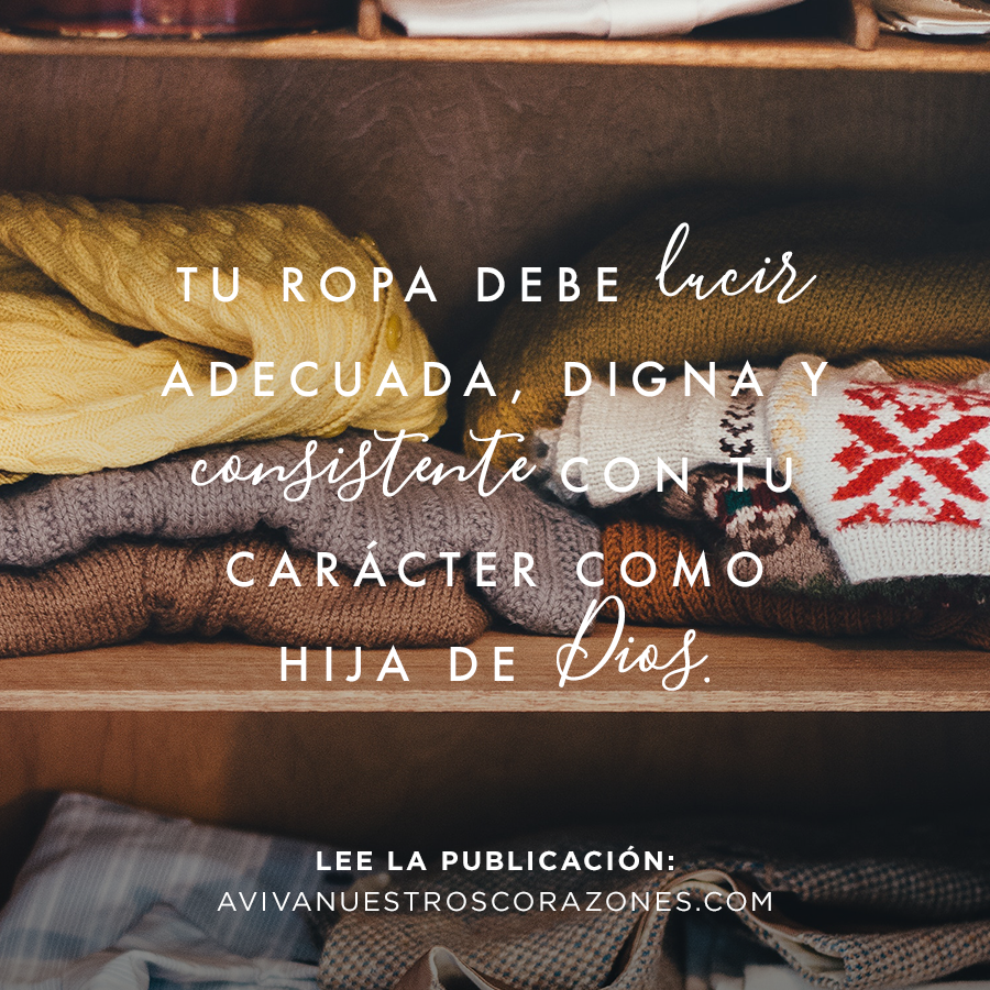 El entender el propósito de la vestimenta y el hacerte estas preguntas: ¿Luce bien o es apropiada? ¿Es decente? ¿Es moderada?, te ayudará a determinar cómo vestirte. Y no te olvides de involucrar a “tu Ayudador” en ese proceso. El Espíritu Santo es un recurso invaluable a la hora de asistirnos y de ayudarnos a darnos cuenta de si nuestra apariencia glorifica a Dios. Si tu corazón está correcto y buscas Su guía, Él será tu consultor personal de vestuario y te enseñará qué puedes ponerte y qué no.
