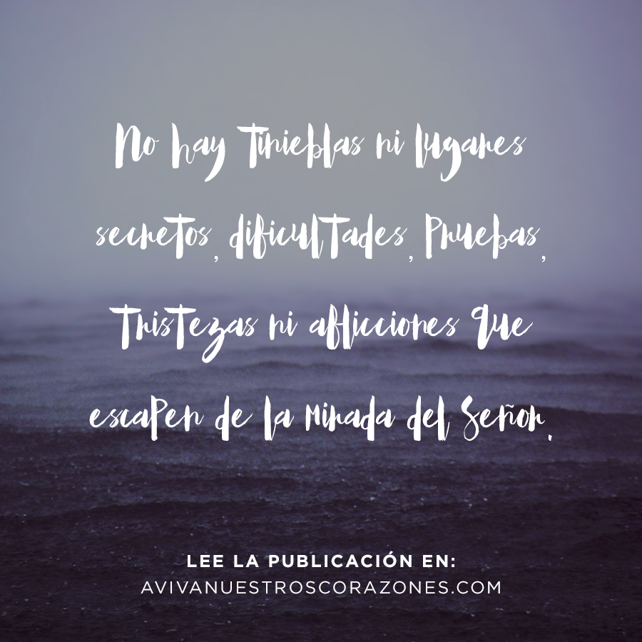 Los mismos ojos amorosos que penetraban la oscuridad secreta de mi matriz, son los que lo observan en los lugares más recónditos del planeta donde él tenga que ir, no hay tinieblas ni lugares secretos, dificultades, pruebas, tristezas ni aflicciones que escapen de Tu mirada de amor.