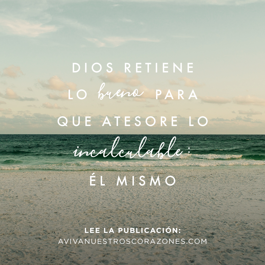 En nuestras propias fuerzas no es posible deleitarnos en la dulzura y valor supremo de Jesús por encima de todo lo demás. Y, sin embargo, con Su gracia nuestros corazones crecerán en fe y reposo. Esta gracia es para ti, si eres hija de Dios. Quizá nunca sepas por qué Él retarda el matrimonio, pero descansa en la seguridad de que, como hija Suya, ¡Dios no te ha abandonado! Al que no eximió ni a Su propio Hijo para tu bien supremo, ciertamente te concederá todo lo que necesites, mientras sigues a Jesús en esta vida. (Ro. 8:32)