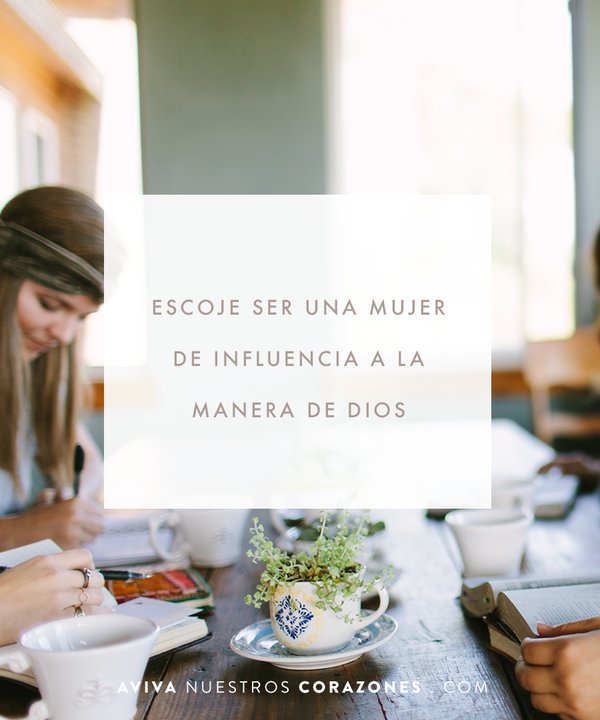 En mi casa, Dios me ha llamado a cuidar de aquello que Dios me ha dado, ocupándome con esmero y excelencia hacer de este lugar un oasis para todos aquellos que pasen por ella. Y en mi trabajo y con amigos, a seguir dando testimonio de que Dios es el que tiene el timón de mi vida sobre cada circunstancia y que no importa lo que ha de venir, mi Dios es un buen padre y su voluntad es perfecta. Por eso escojo ser una mujer de influencia a la manera de Dios, atada a su Verdad y pidiéndole cada día que me conceda la oportunidad de contagiar a otros de la bendición que es vivir el diseño de Dios, este valor sobrepasa por mucho a las joyas y es eterno.