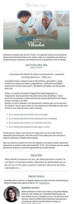 Gracias por unirte a «El reto de los abuelos: 10 días para animarte en tu herencia espiritual» de Aviva Nuestros Corazones. Durante los próximos diez días, recibirás diariamente un correo electrónico que incluye: